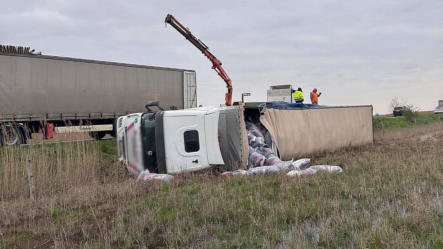 A műszaki mentés megkezdődött, ahol a rakományt először egy másik járműre kézi erővel kell átpakolni. Ezután lehet csak kerekeire állítani a felborult járműszerelvényt, amihez daru is érkezett, emiatt forgalomkorlátozás várható az érintett szakaszon.