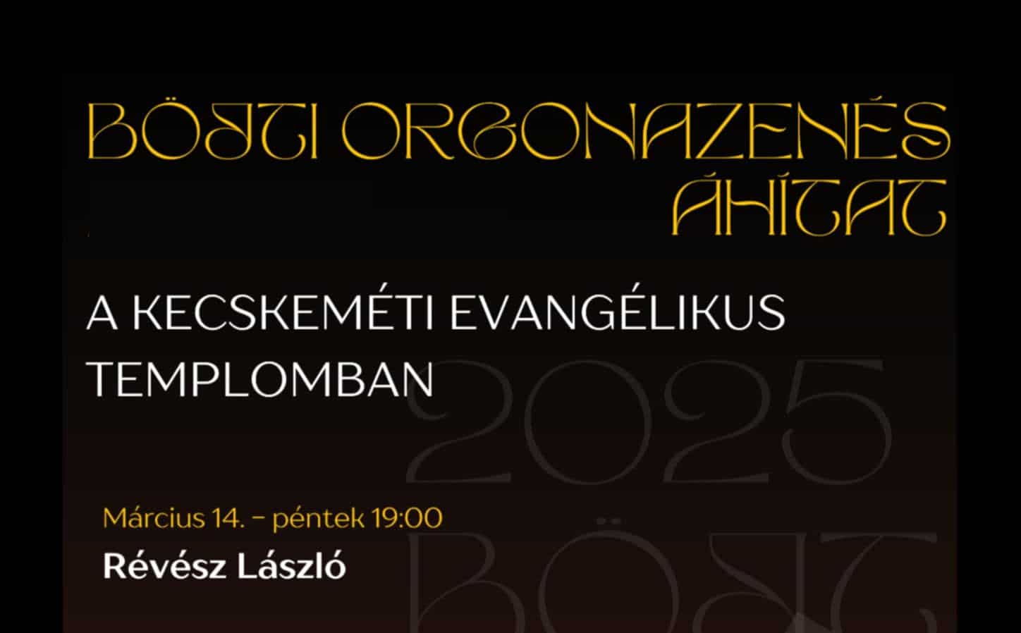Március 14-én – egy öt alkalomból álló sorozat első estjeként – Révész László orgonaművész közreműködésével orgonazenés áhítat lesz az evangélikus templomban. A Kodály Iskola művész-tanára előadásában többek között Bach-, Reger- és Liszt-művek hangoznak majd el. A 19 órakor kezdődő program célja egyrészt az, hogy az érdeklődők a mindennapok zajos forgatagából kiszakadva a muzsikán keresztül meghallják Isten üzenetét, másrészt adományaikkal az evangélikus közösség 97 éves hangversenyorgonájának felújítását is támogathatják.